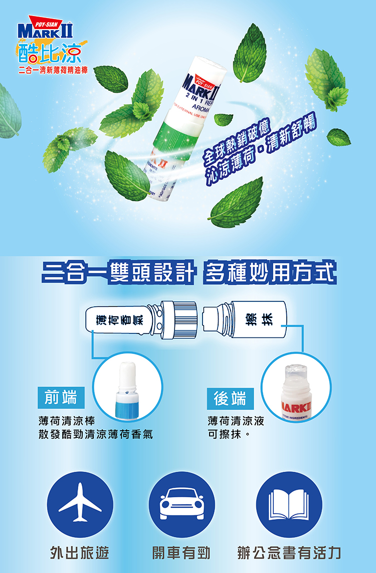 使用方式: 使用商品前端可散發薄荷香氣 商品後端可擦抹於肌膚表層!