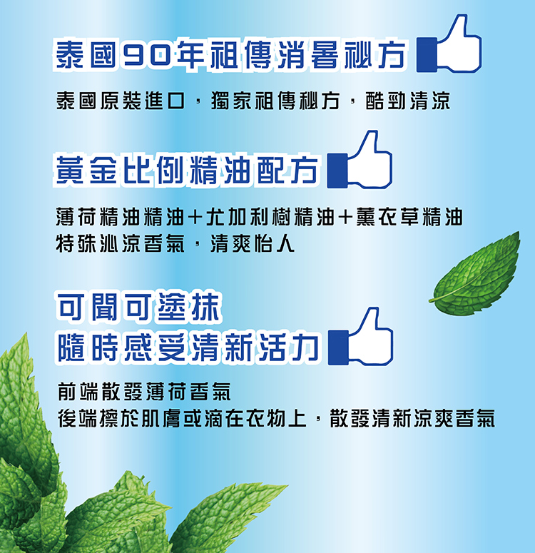 用途:擦抹於肌膚表層散發沁涼薄荷味